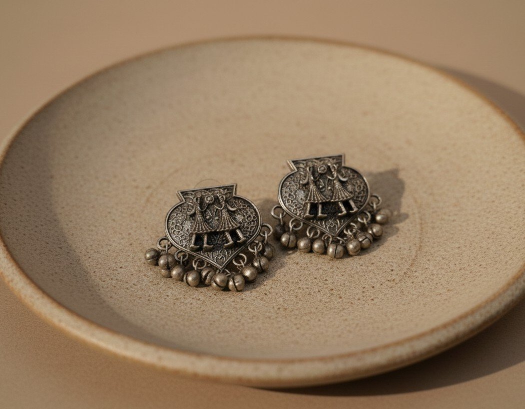A sculpted stud earring featuring twin dancing figures set within a shield-shaped frame. Fine engraved detailing and dangling bead elements add movement, echoing the rhythm and grace of classical Indian dance traditions.