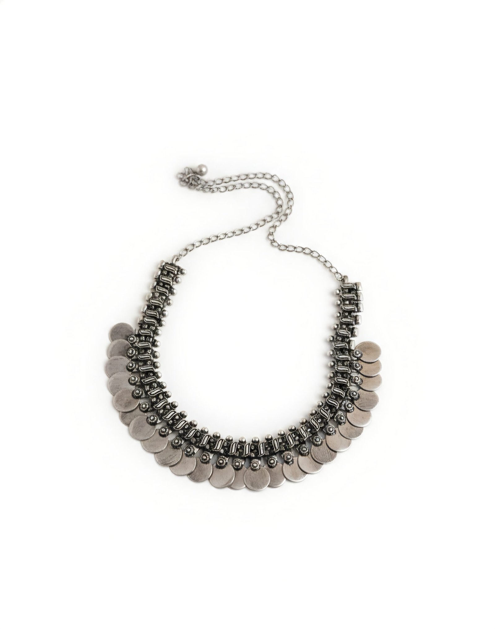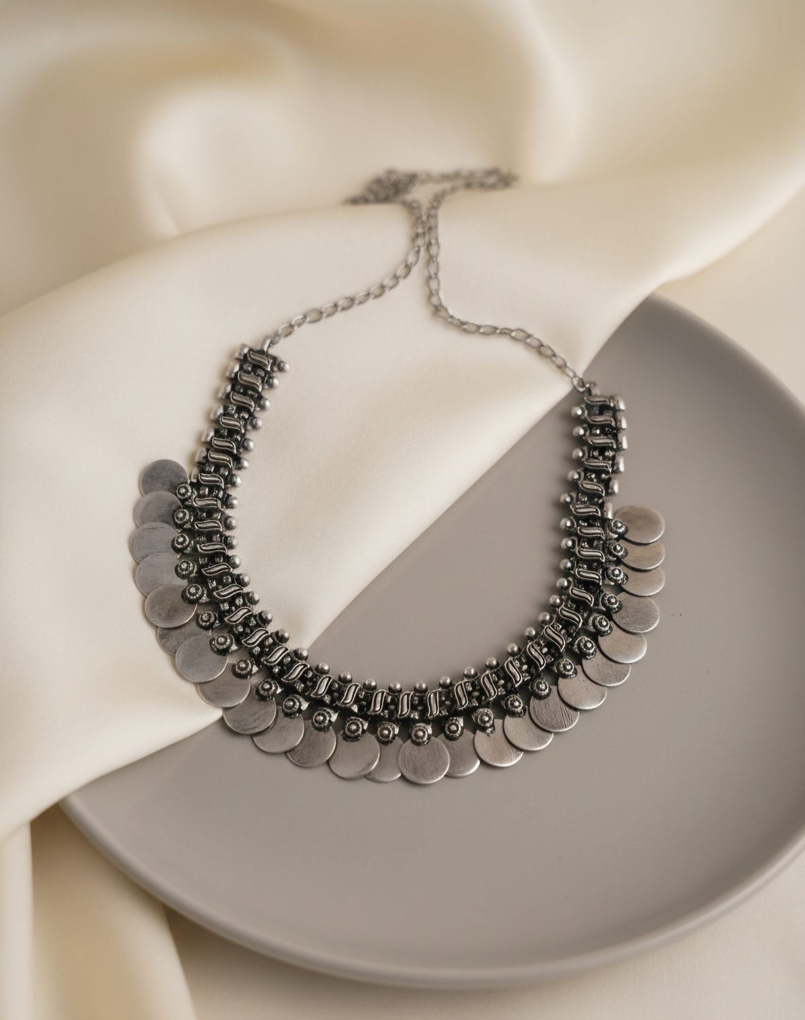 A statement necklace featuring a rhythmic arrangement of flat silver coins linked together in a layered formation. The repeated circular elements create movement and texture, giving the piece a bold yet balanced presence rooted in traditional Indian ornamentation.