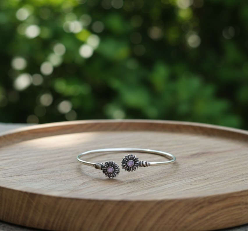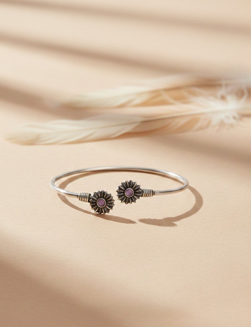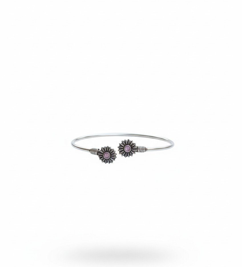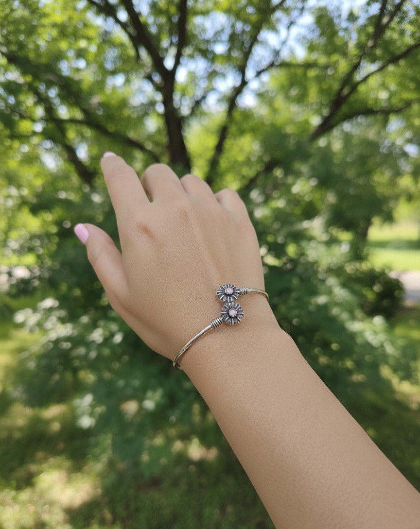 A delicate open kada featuring twin floral motifs accented with soft pink stone centres. The slim circular band and balanced placement create a light, graceful silhouette suited for everyday wear.