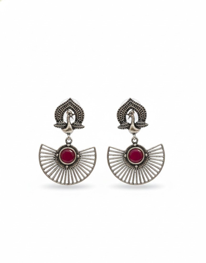 Statement earrings featuring a peacock-inspired stud paired with a fan-shaped jharoka drop. The open metalwork and central coloured stone create a bold yet airy silhouette with traditional detailing.