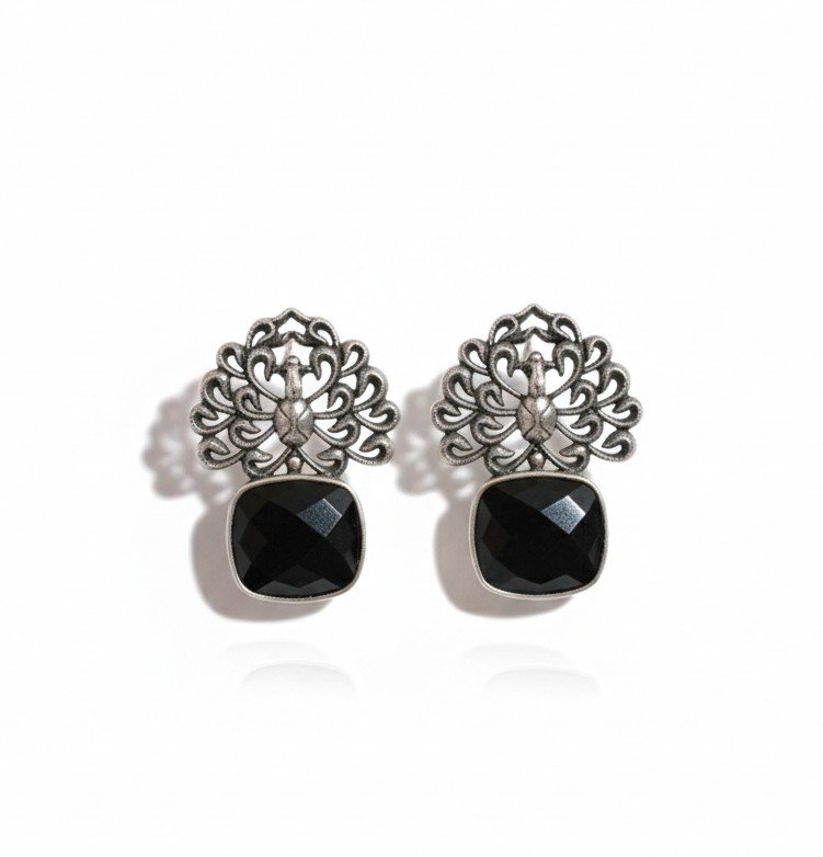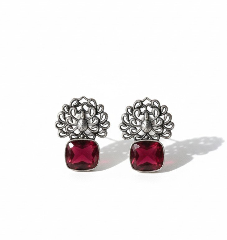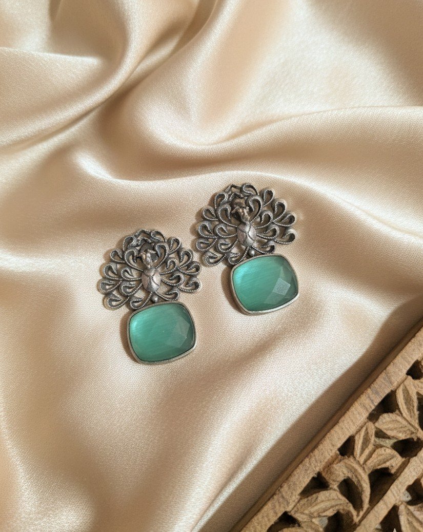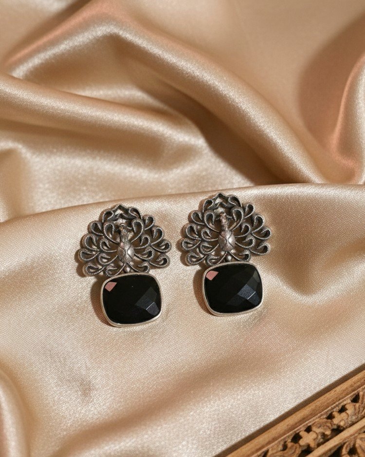 These stud earrings feature an intricately detailed peacock motif forming an open, lace-like silhouette at the top. A faceted square-cut stone drop anchors the design, creating a balanced contrast between delicate metalwork and bold geometry. The structured form keeps the piece refined while the motif adds a distinctive, traditional character.