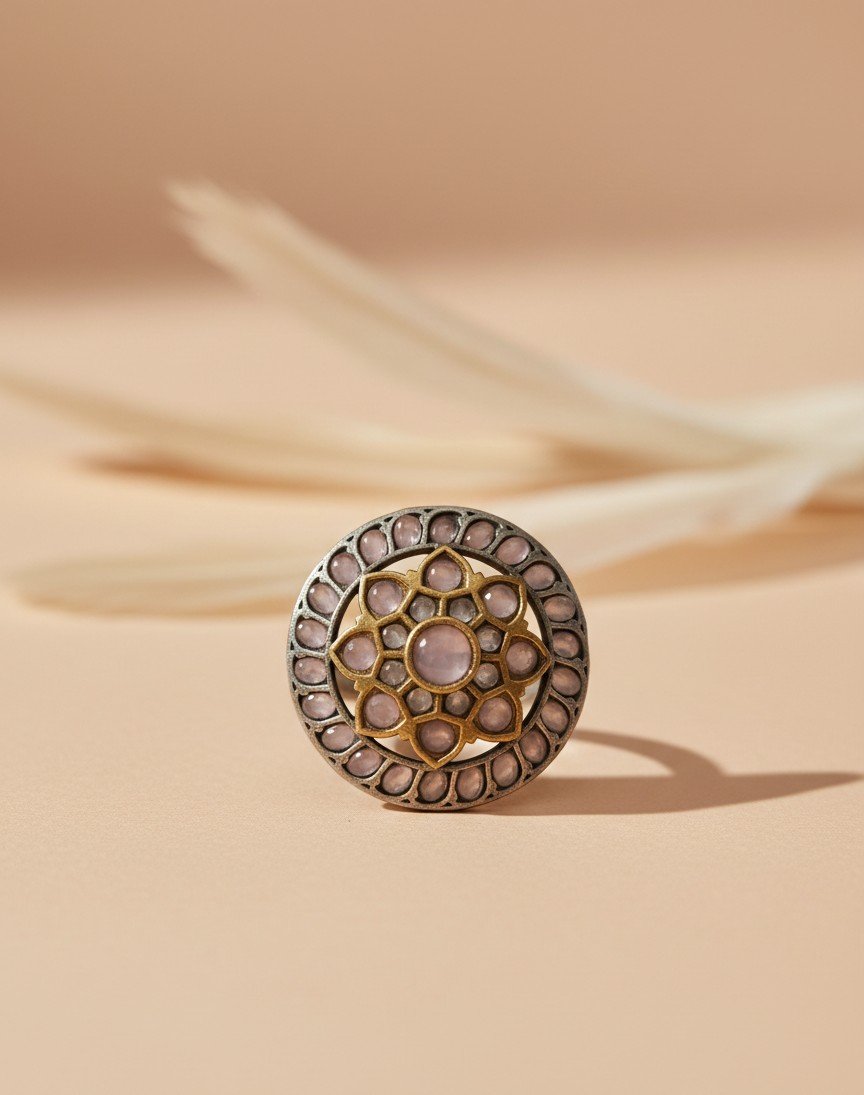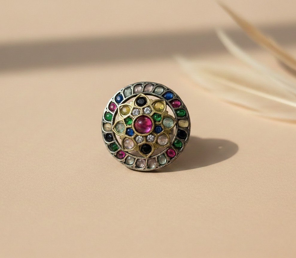 A statement ring featuring a lotus-inspired circular design with finely set stones in an antique finish. Crafted to balance colour, symmetry, and Indian heritage, perfect for ethnic and fusion wear.