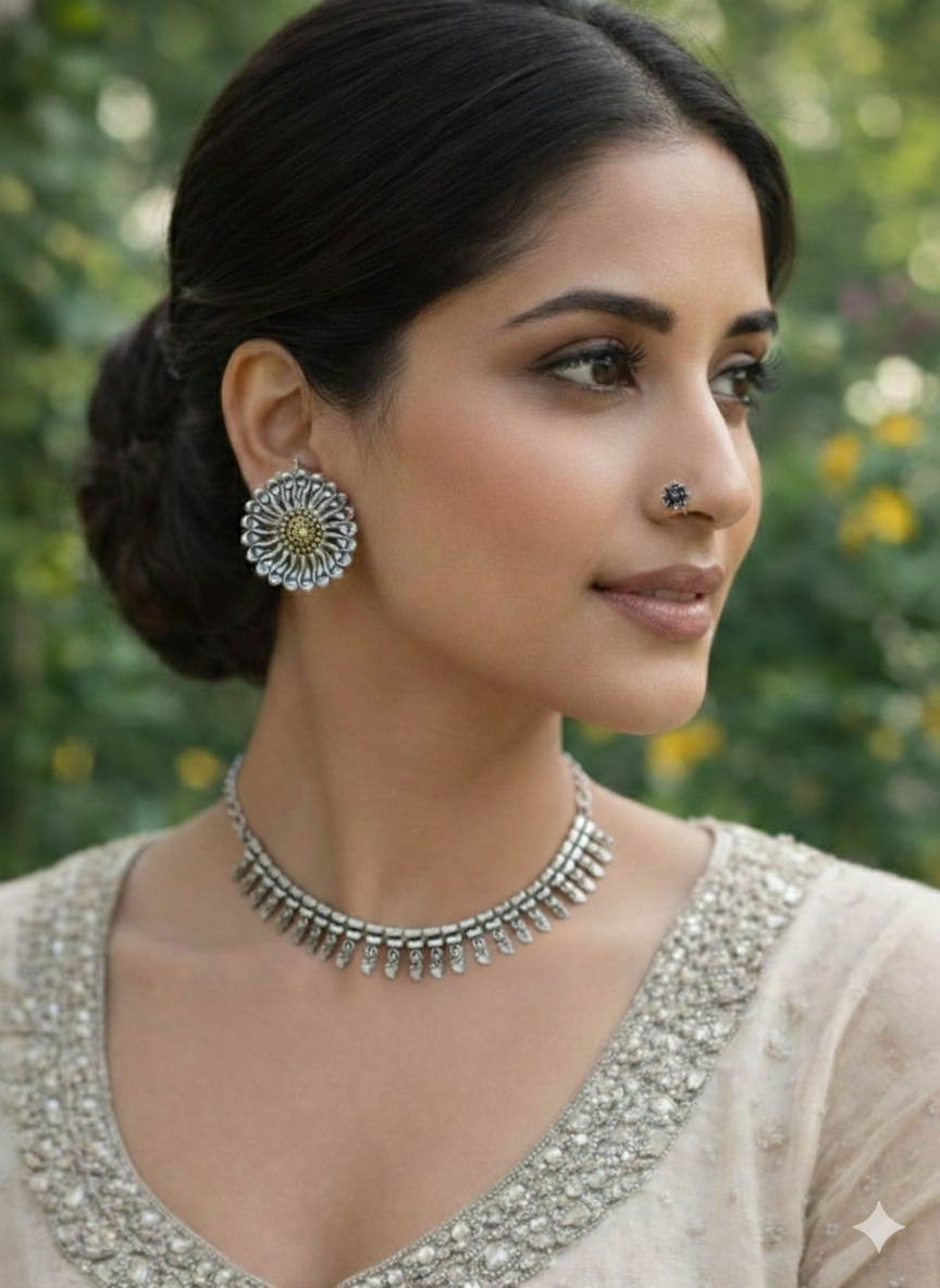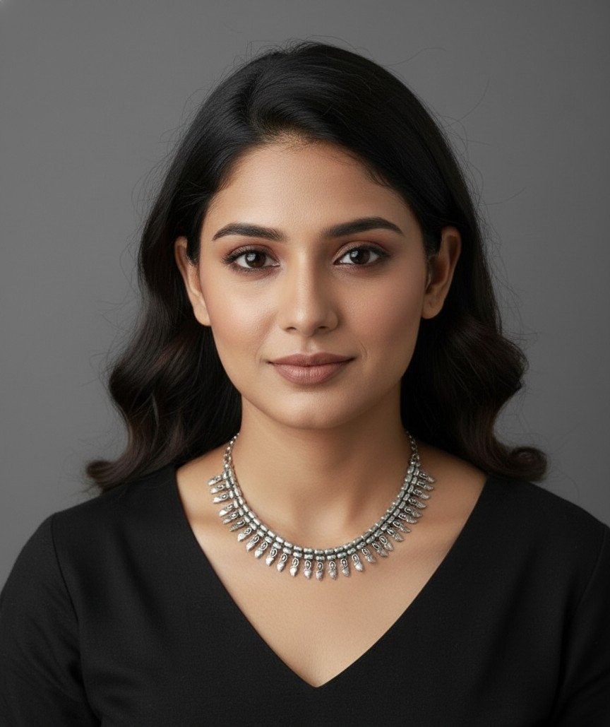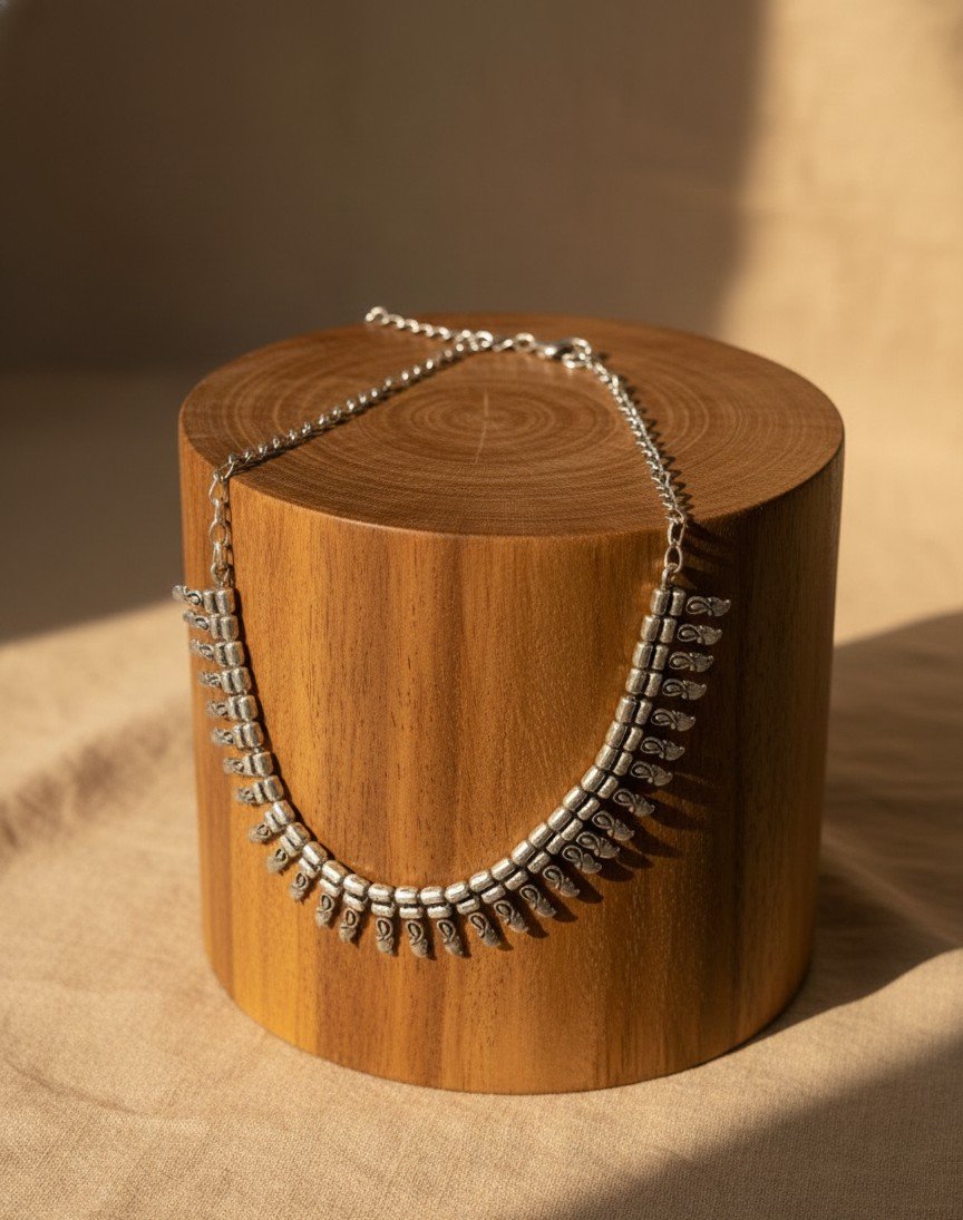 A delicately crafted necklace featuring a fine row of small floral elements arranged in a gentle curve. The evenly spaced motifs create a soft rhythm along the neckline, giving the piece a refined and understated presence inspired by traditional Indian floral ornamentation.
