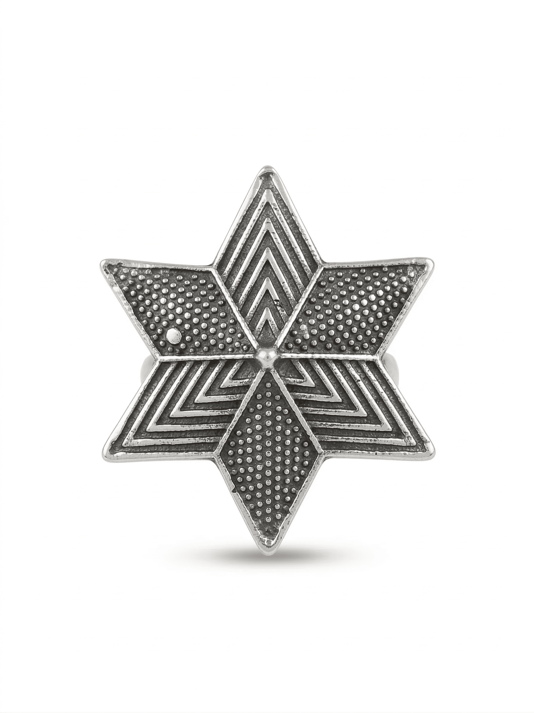 This finger ring features a striking six-point star motif that forms a sharp geometric bloom at the centre. Each segment alternates between engraved chevron lines and fine dotted textures, creating visual depth across the surface. A small polished centre bead highlights the symmetry and intricate craftsmanship of the star-inspired design.