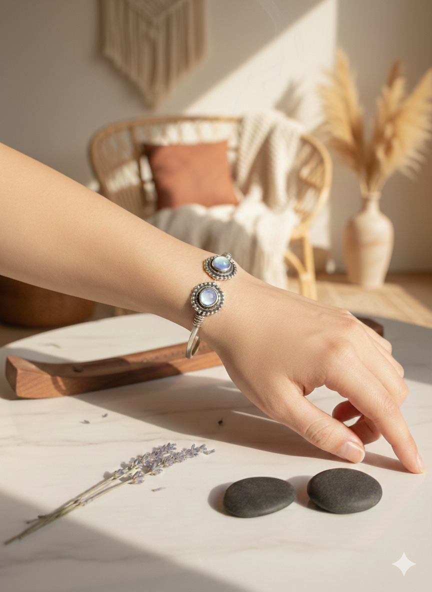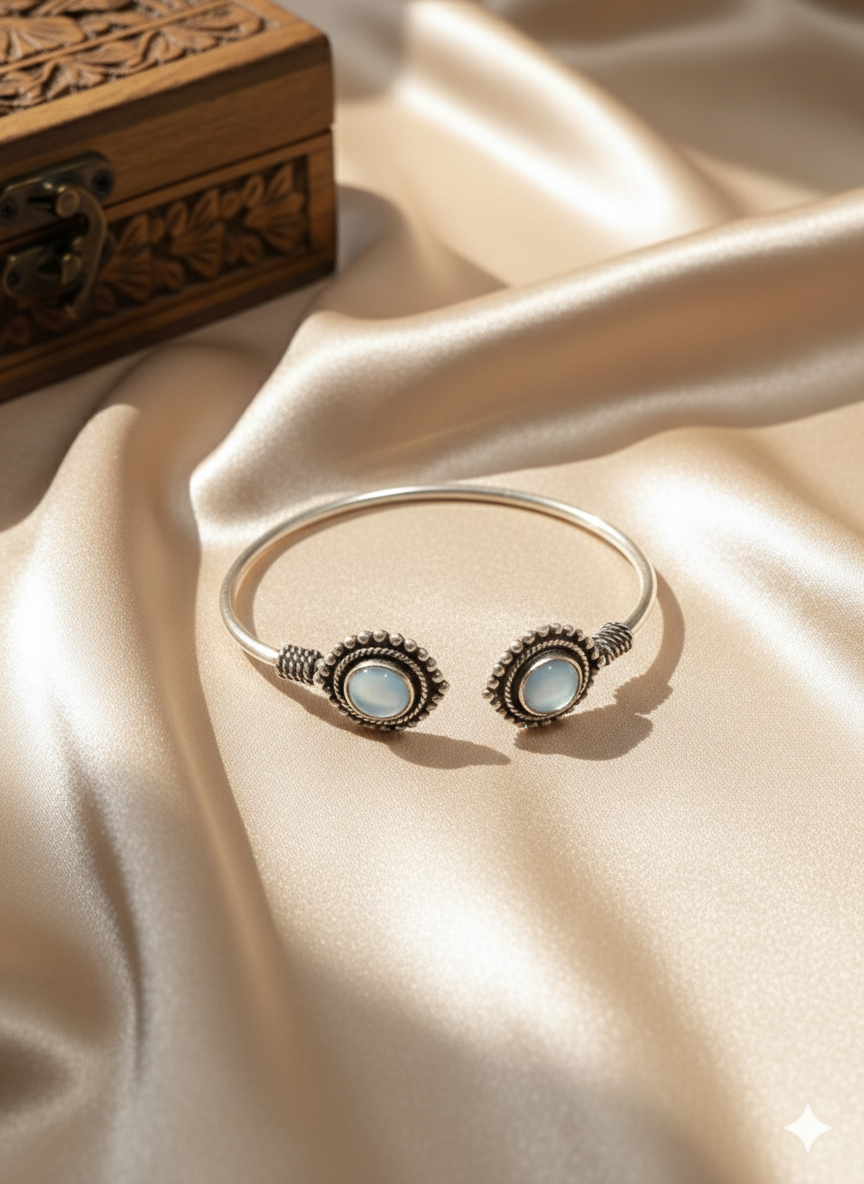 A refined open kada featuring oval blue stone settings framed with beaded detailing at each end. The slim circular band and clean symmetry give the piece a calm, composed look with subtle vintage character.