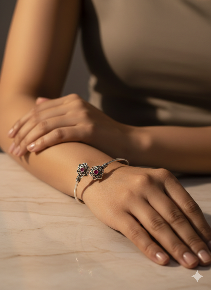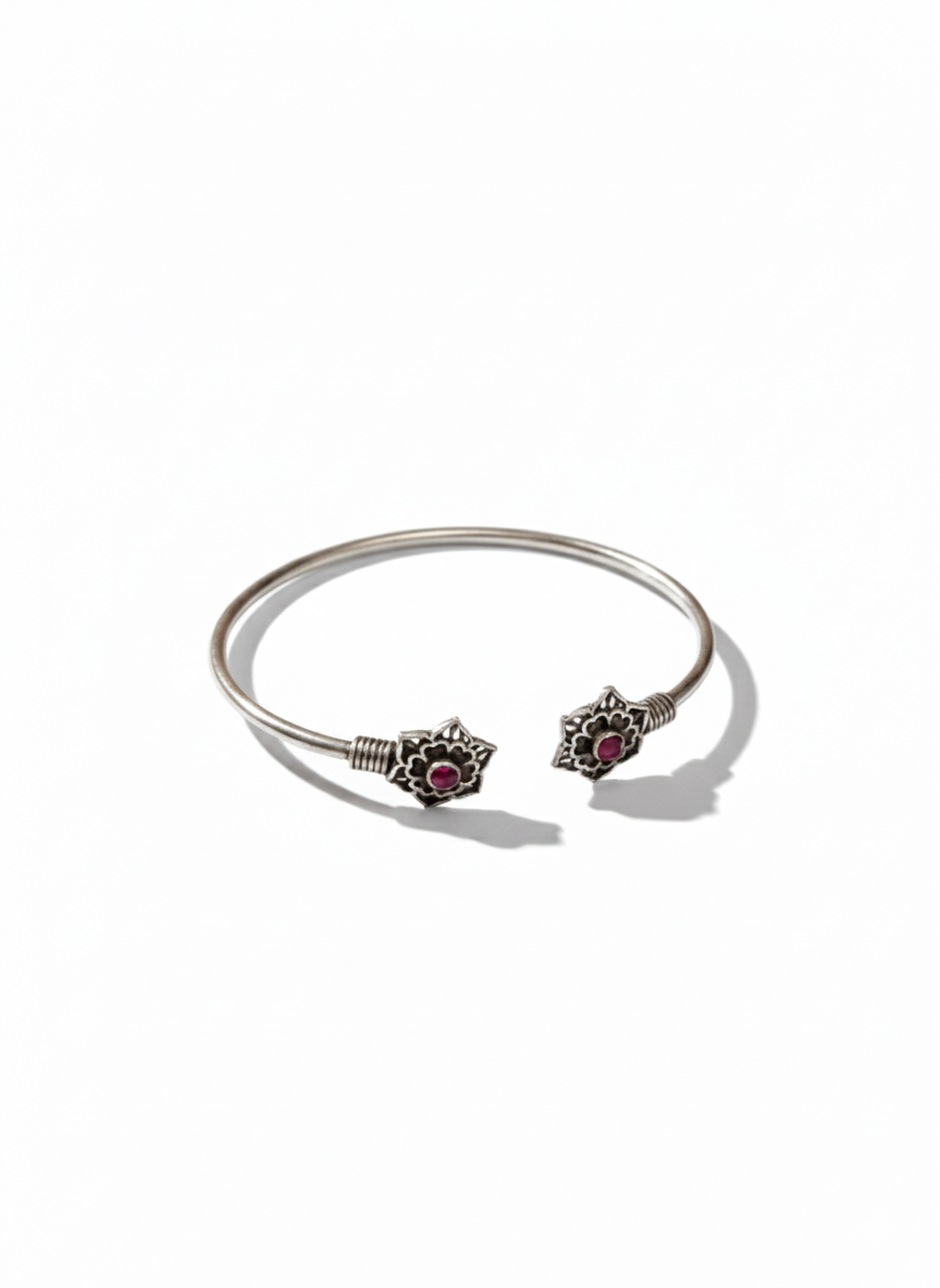 An elegant open kada featuring lotus-inspired mandala motifs at each end, detailed with a central magenta stone. The slim circular band and symmetrical form create a composed, traditional look suited for everyday wear.