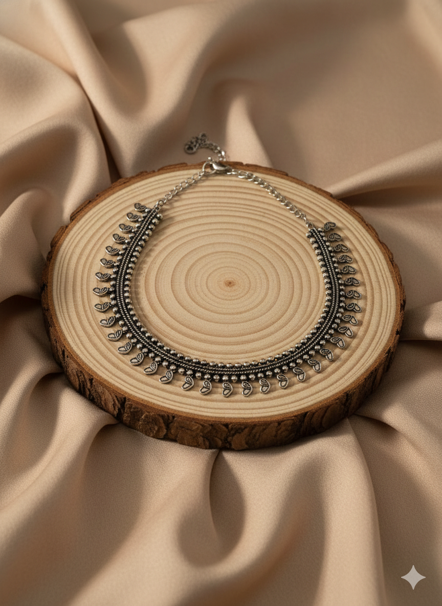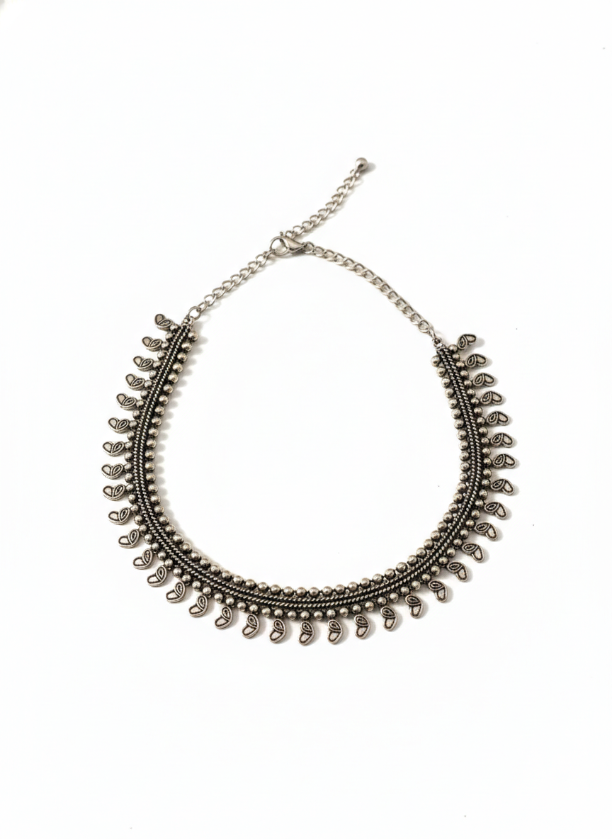 A statement necklace featuring a rhythmic row of heart-shaped metal drops arranged along a structured silver base. The repeated heart elements add softness and movement, creating a balanced design that feels delicate yet bold, inspired by traditional Indian ornamentation with a contemporary edge.