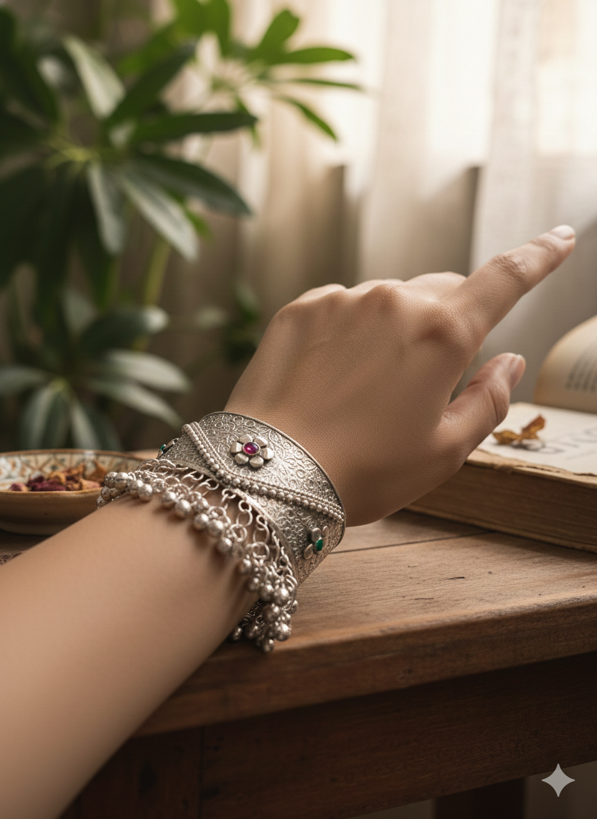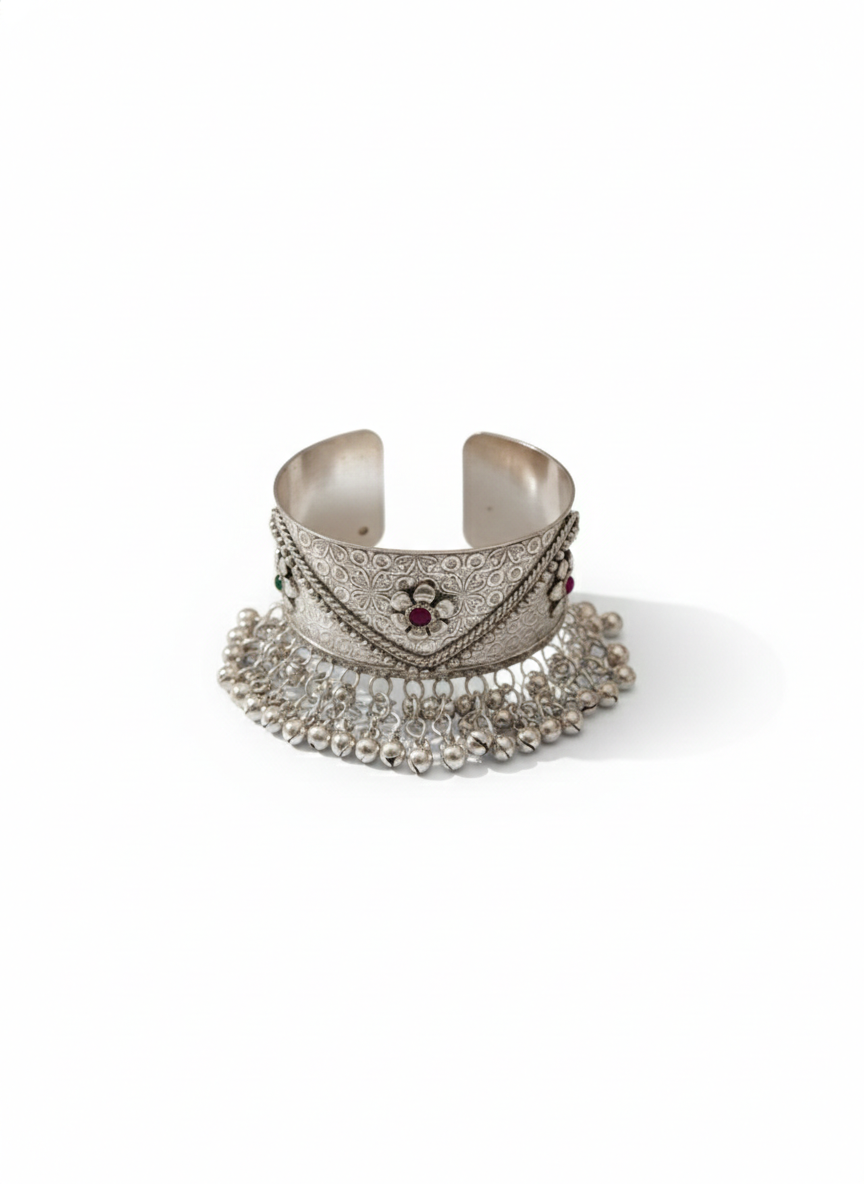A bold open kada featuring a wide engraved band with a central floral detail. Finished with a layered fringe of ghungroo beads along the edge, the piece brings together structure, texture, and movement in a traditional yet striking form.