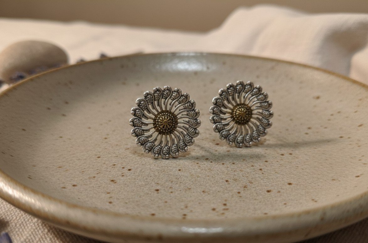 Stud earrings inspired by a sun-bloom form, featuring finely detailed radiating petals around a subtle central accent. The circular silhouette feels balanced, refined, and handcrafted.