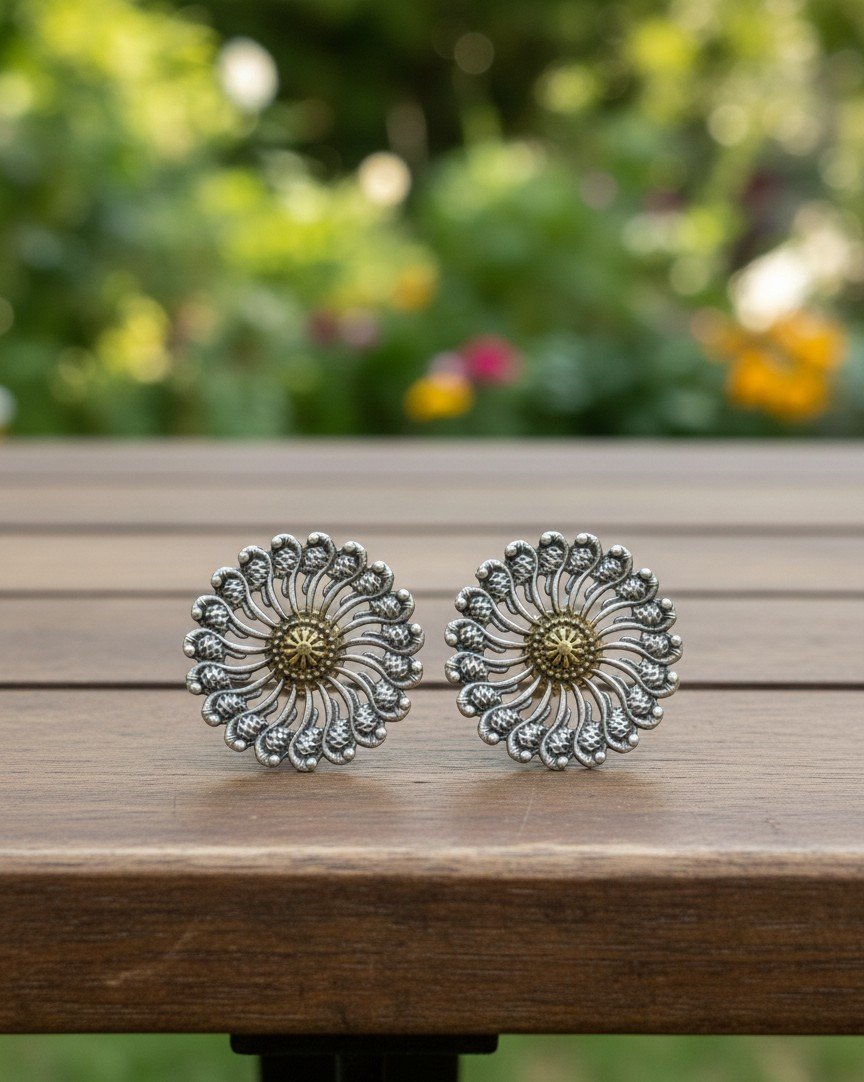 Surya Pushp Floral Stud Earrings – Oxidised Silver Jewellery